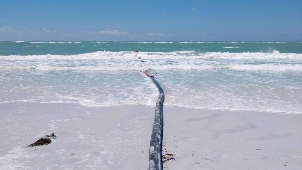Mersino installed a 620-foot wellpoint dewatering system, discharging into the Gulf of Mexico. Despite challenges from tides and wildlife, the team secured the discharge pipe with concrete anchors, completing the project successfully and on time.